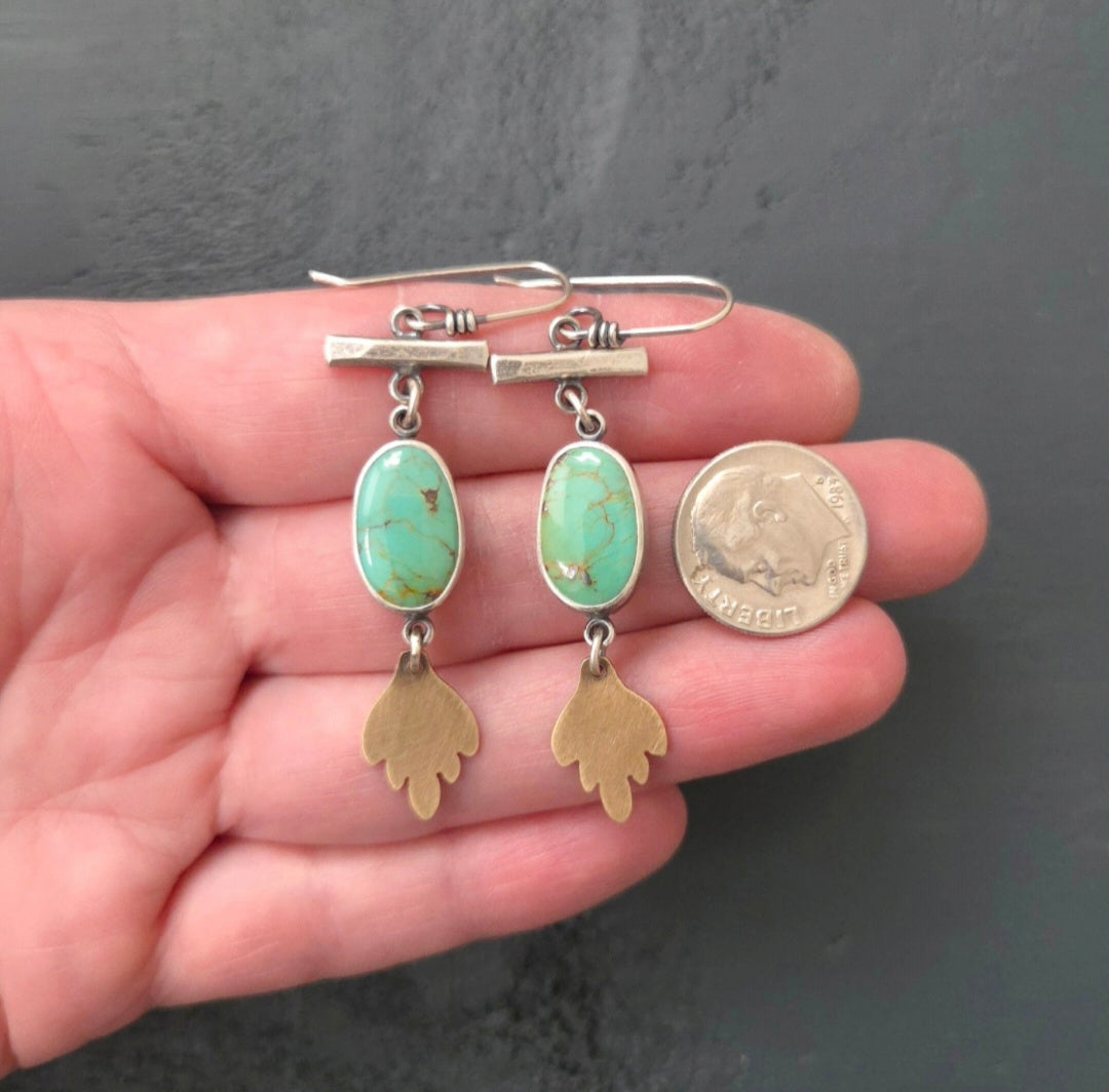 Kingman turquoise simply set in fine silver with a sterling silver backplate and handmade ear wires. Sterling silver details and brass dangles. Oxidized, textured, and buffed for a soft glow. Photos taken in natural light, color may vary slightly from screen to screen. Made with love and intention.