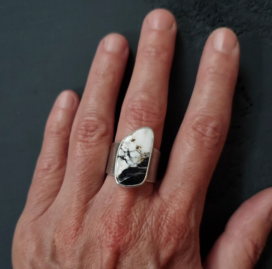 White Buffalo simply set in fine silver with a sterling silver backplate and band. Oxidized, lightly textured, and buffed for a soft glow. Photos taken in natural light, color may vary slightly from screen to screen. Made with love and intention.