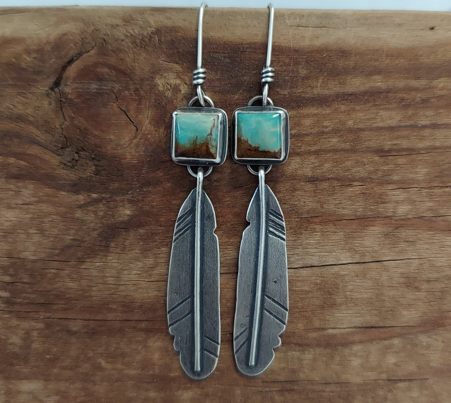 Kingman turquoise from Arizona set in fine silver with a sterling base and handmade sterling feather and ear wire. Oxidized finish. Photos taken in natural light, color may vary slightly from screen to screen. Made with love.